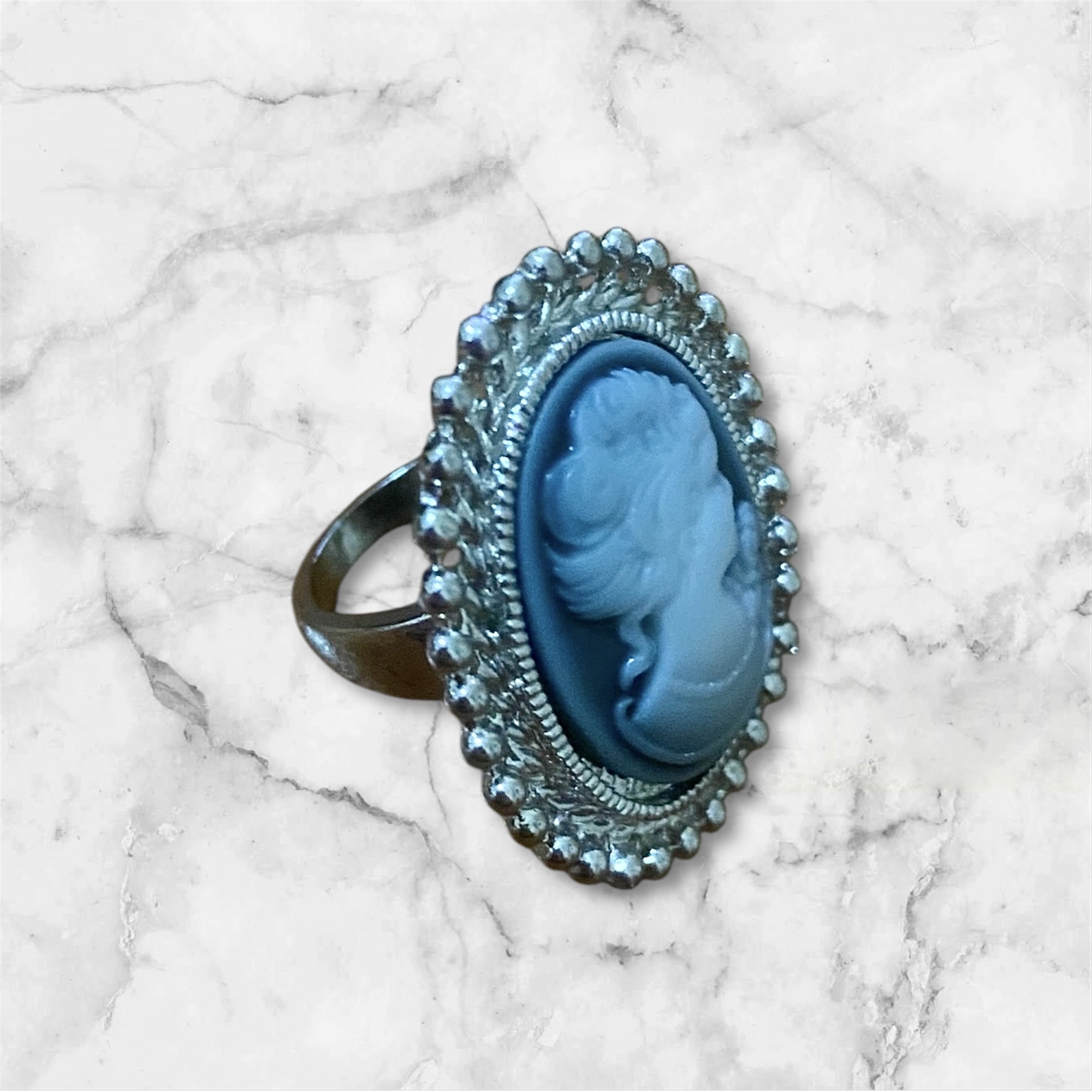 Anel camafeu vintage com base prateada e detalhe em resina cinza, trazendo o clássico rosto entalhado em alto-relevo. Elegante, atemporal e perfeito para quem ama estética retrô. Na finalização do pedido: informe o tamanho, (Os tamanhos disponíveis são 16, 17, 18, 19 e 20.)