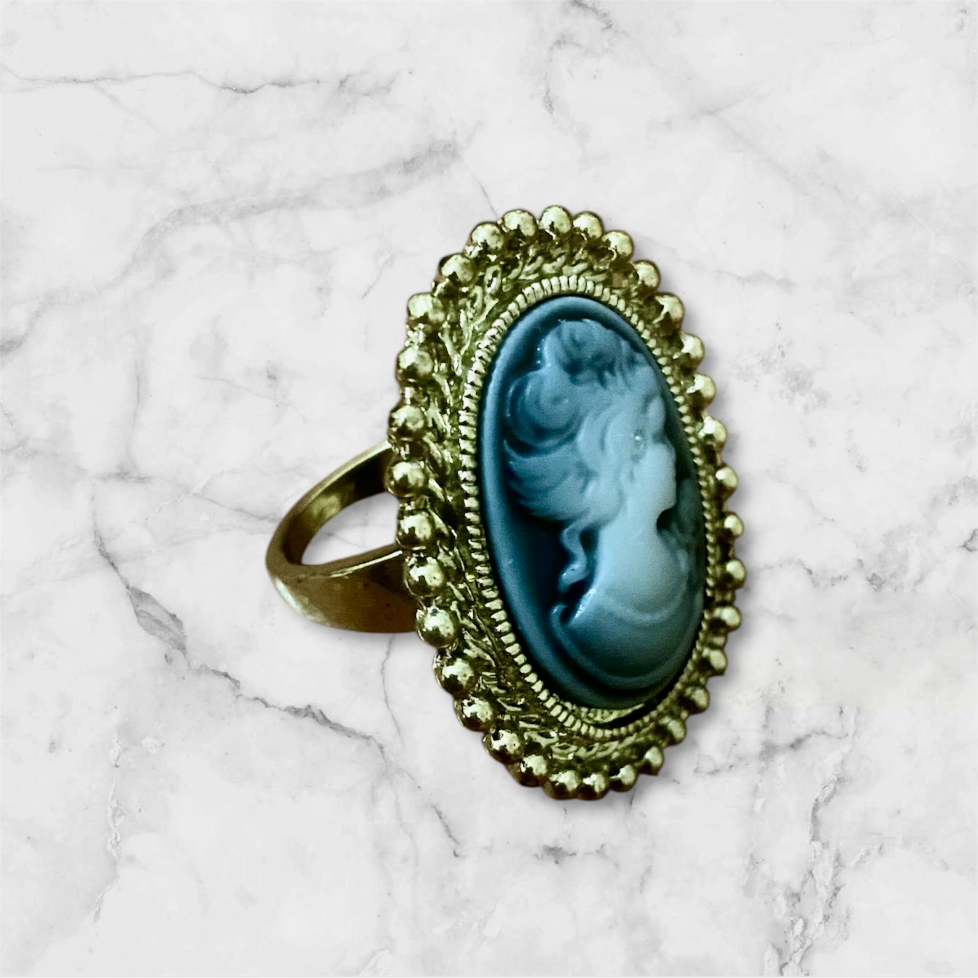 Anel camafeu vintage com base dourada e detalhe em resina cinza, trazendo o clássico rosto entalhado em alto-relevo. Elegante, atemporal e perfeito para quem ama estética retrô. Na finalização do pedido: informe o tamanho, (Os tamanhos disponíveis são 16, 17, 18, 19 e 20.)