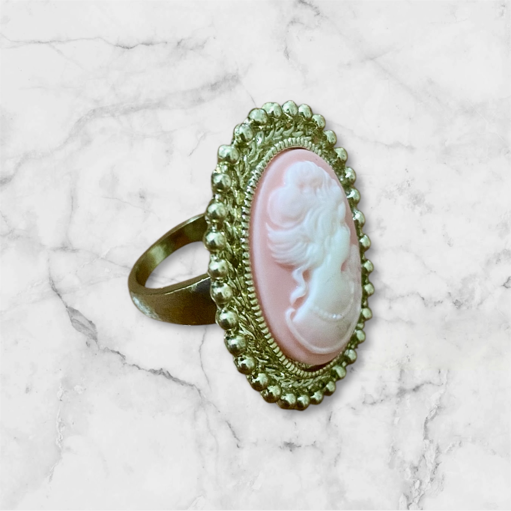 Anel camafeu vintage com base dourada e detalhe em resina rosé, trazendo o clássico rosto entalhado em alto-relevo. Elegante, atemporal e perfeito para quem ama estética retrô. Na finalização do pedido: informe o tamanho, (Os tamanhos disponíveis são 16, 17, 18, 19 e 20.)