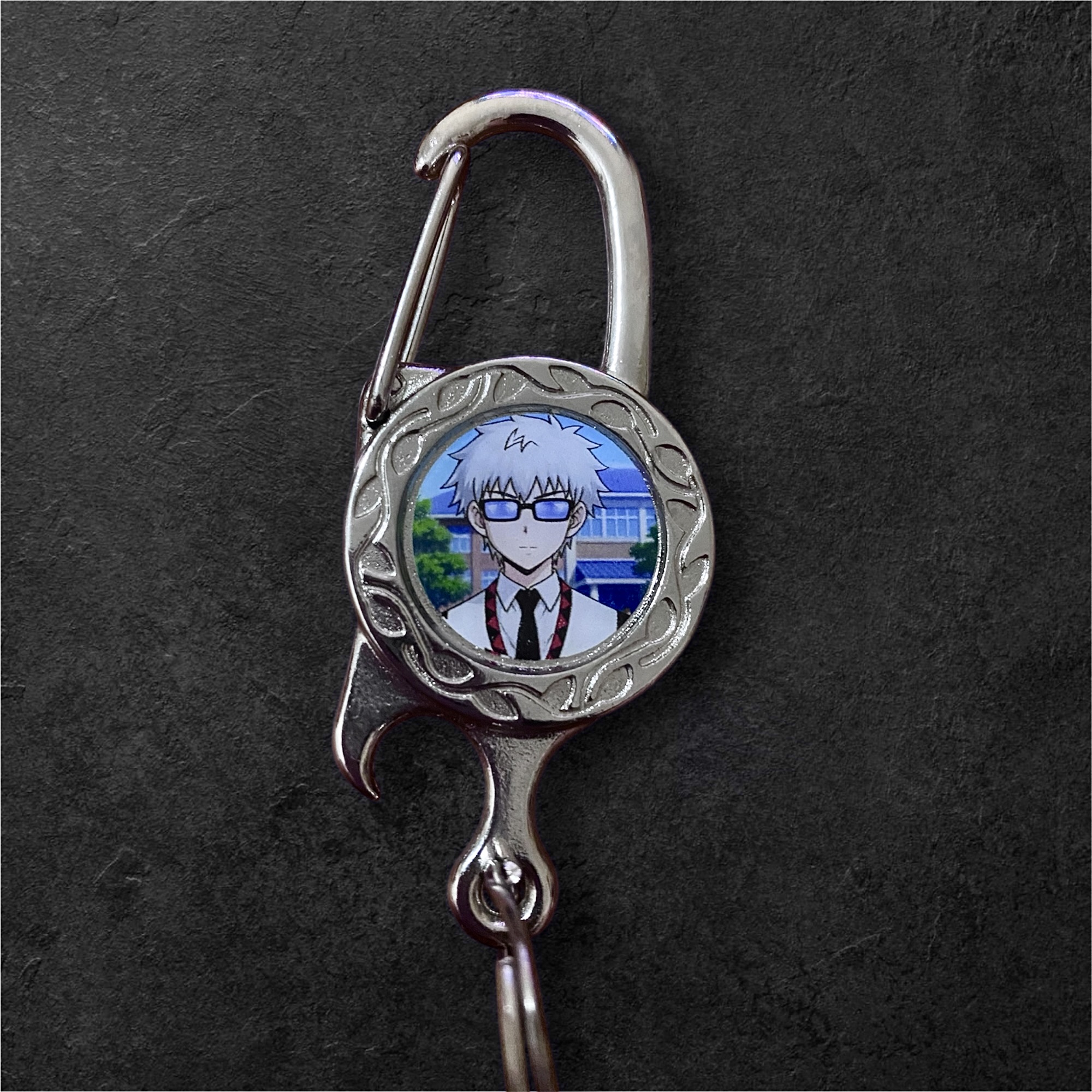 Chaveiro metálico com mosquetão prateado, trazendo o personagem Brian Midorima em um medalhão com detalhes em arabesco. Além do visual estiloso, o corpo do chaveiro possui função abridor de garrafas, tornando-o prático e funcional. A arte em tons claros destaca sua personalidade séria e intelectual, criando um visual harmonioso e elegante.