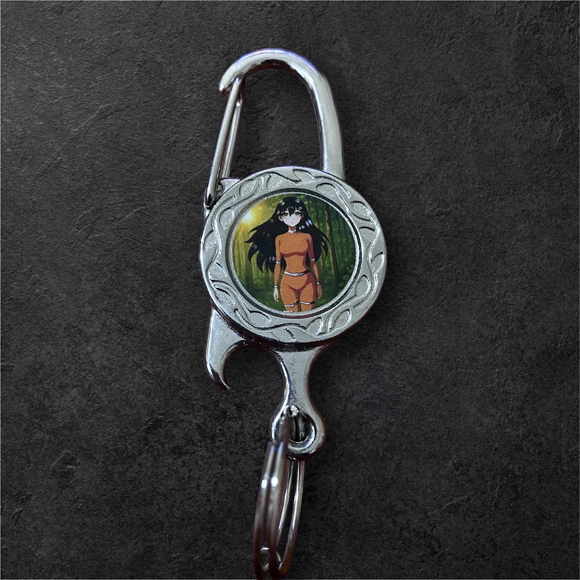 Chaveiro metálico com mosquetão prateado, trazendo a personagem Naomi Kiseki em um medalhão com detalhes em arabesco. Além do visual estiloso, o corpo do chaveiro possui função abridor de garrafas, sendo prático e funcional. A arte em tons suaves ressalta o charme e a elegância da personagem.