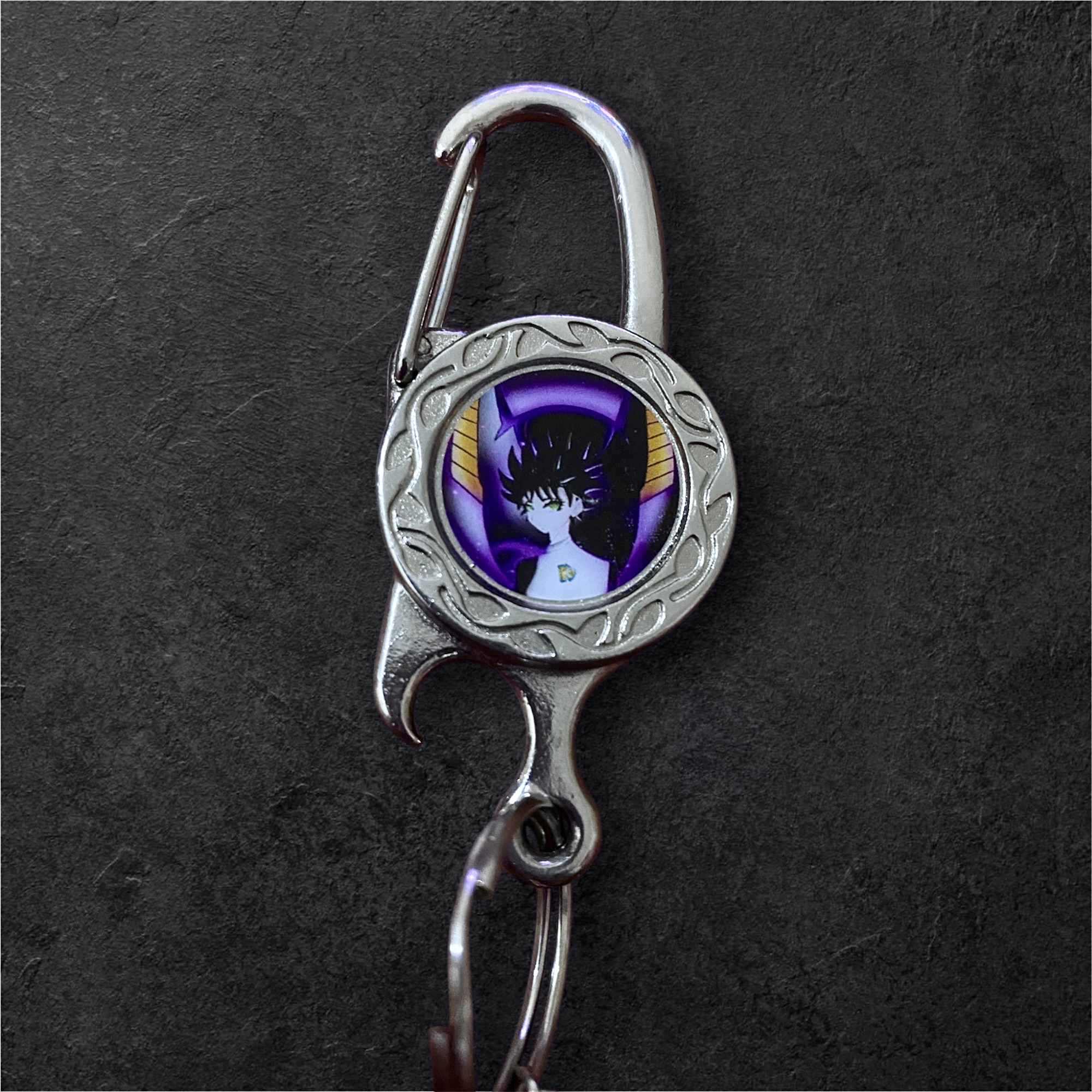 Chaveiro metálico com mosquetão prateado, trazendo o personagem Yatoru Kiseki em um medalhão com detalhes em arabesco. Além do visual estiloso, o corpo do chaveiro possui função abridor de garrafas, tornando-o prático e funcional. A arte em tons de roxo dá destaque ao visual misterioso do personagem, acompanhado por um pingente de espada de aço inoxidável completa o design e reforça o estilo fantasia do acessório.