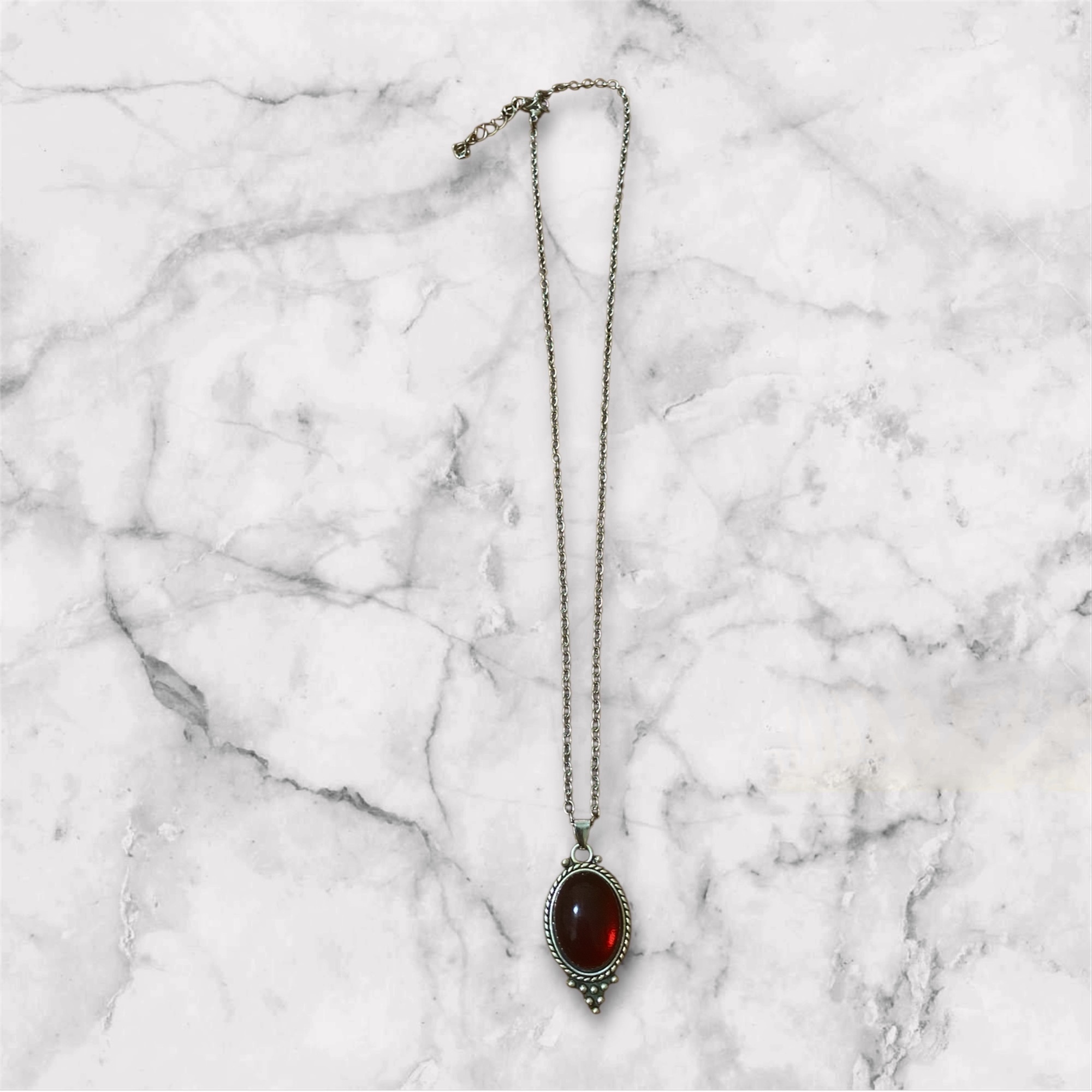 Colar vintage com corrente delicada e pingente oval em pedra vermelha translúcida, acabamento em metal envelhecido e detalhes clássicos. Elegante e atemporal para compor looks sofisticados.
